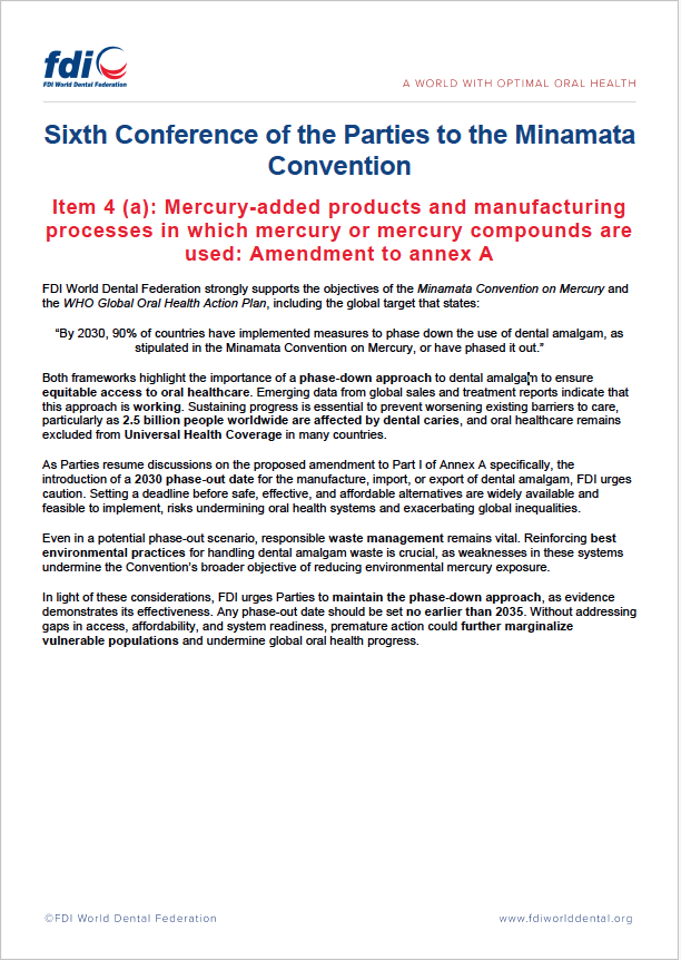 FDI World Dental Federation strongly supports the objectives of the Minamata Convention on Mercury and the WHO Global Oral Health Action Plan, including the global target that states: